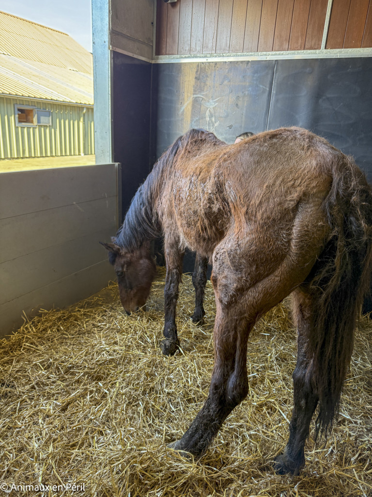 Les deux juments ont été installées dans des box confortables pour y passer une première nuit au chaud, en sécurité. Déshydratées et affamées, elles se sont jetées sur le foin mis à disposition. Les équipes de soigneurs ont immédiatement commencé une réalimentation progressive pour éviter tout choc digestif.