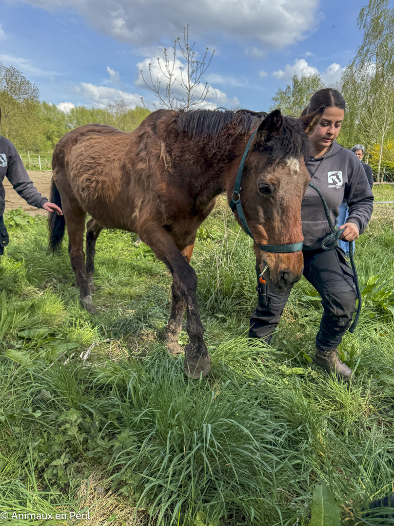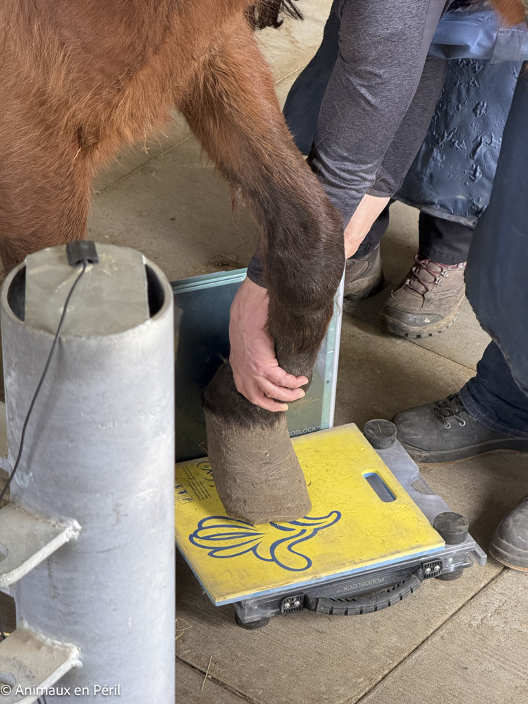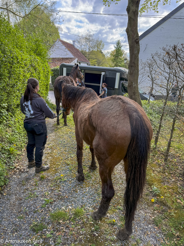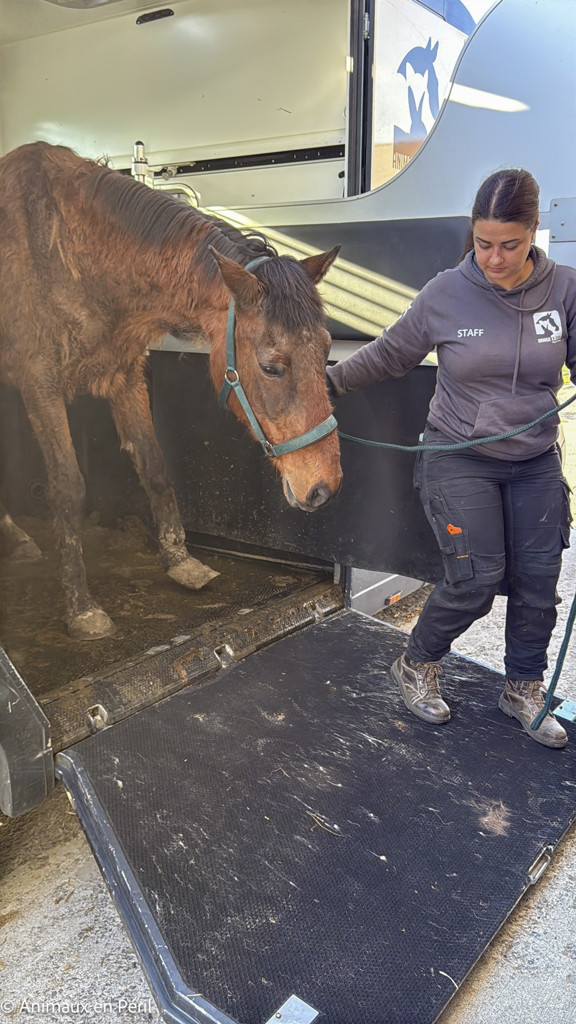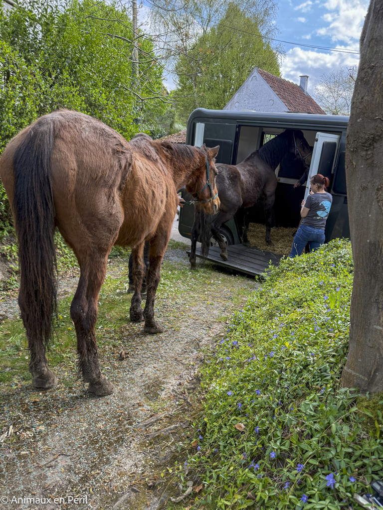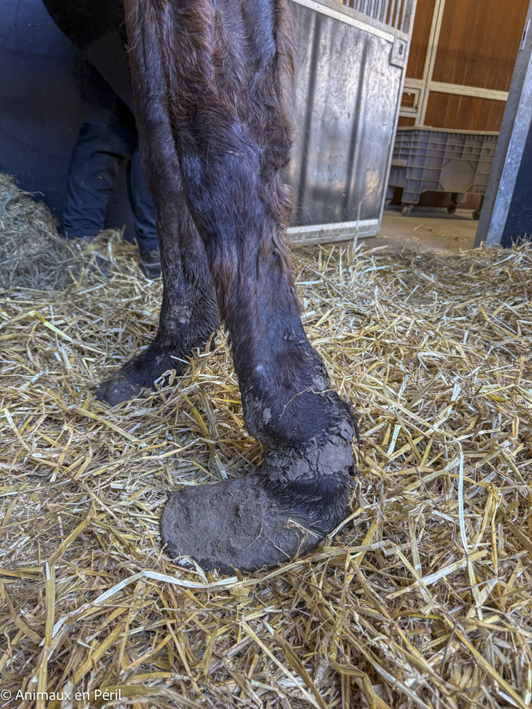 Mais le constat est alarmant. Le problème majeur concerne leurs sabots : non entretenus depuis des années, ils sont devenus extrêmement longs et déformés. L’une des juments se déplace difficilement, chaque pas est une souffrance. Le trajet jusqu’au véhicule a été une véritable épreuve.