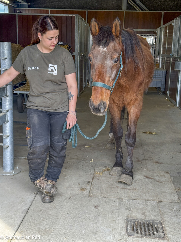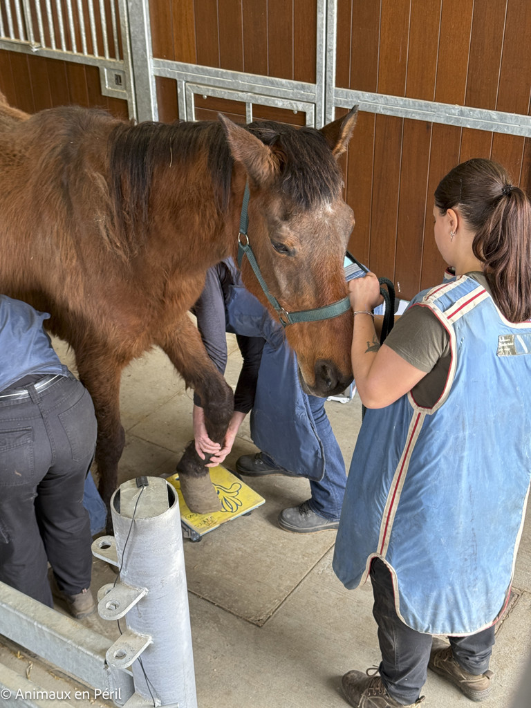 Dès le lendemain, les vétérinaires ont réalisé les premiers examens approfondis. L’une des juments, accueillie par Animaux en Péril, a été renommée Calliopée. Son état est le plus préoccupant : elle souffre d’une luxation ancienne du membre antérieur gauche, associée à une importante formation d’arthrose qui empêche toute flexion normale du membre. Elle reste bloquée dans une position qui provoque des douleurs très vives.
