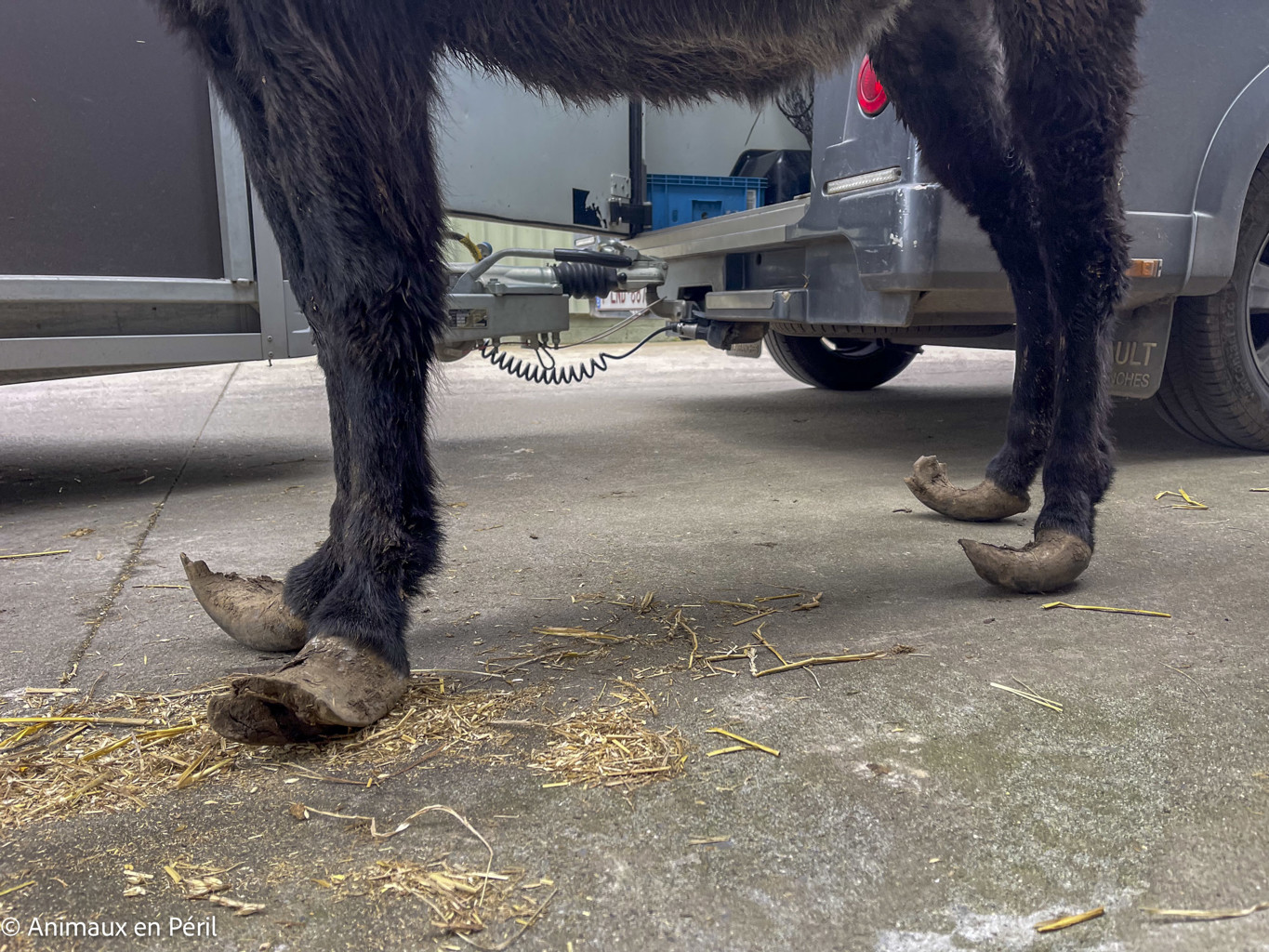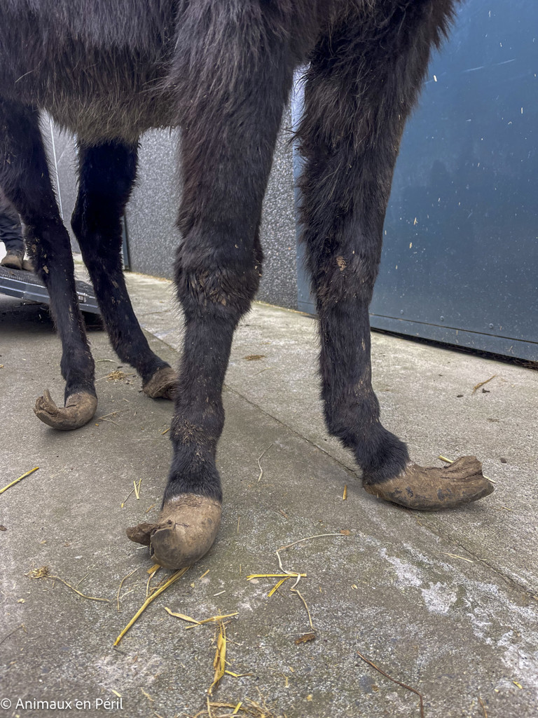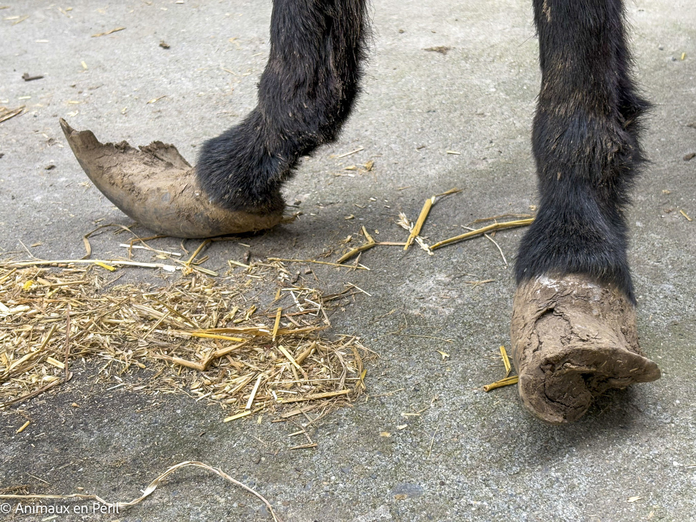 À l’arrivée des soigneurs, le constat fut accablant : les ânes présentaient un état de santé alarmant. Leurs sabots, non entretenus depuis plusieurs années, avaient pris une forme déformée en « babouches », leur causant des souffrances intolérables et rendant leurs déplacements extrêmement douloureux. Une jeune ânesse montrait déjà des signes sévères d’invalidité alors qu’elle n’avait que quelques mois.