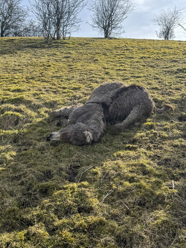 Découverts sur une prairie de plusieurs hectares, les ânes ont été laissés sans soins, sans nourriture adaptée et sans abri. La scène était d’une désolation absolue : deux d’entre eux, un âne adulte et un ânon, avaient déjà succombé aux terribles conditions de détention. Leur mort résulte vraisemblablement d’un manque de nourriture, d’une infestation parasitaire sévère et d’une exposition prolongée aux intempéries sans aucun refuge.