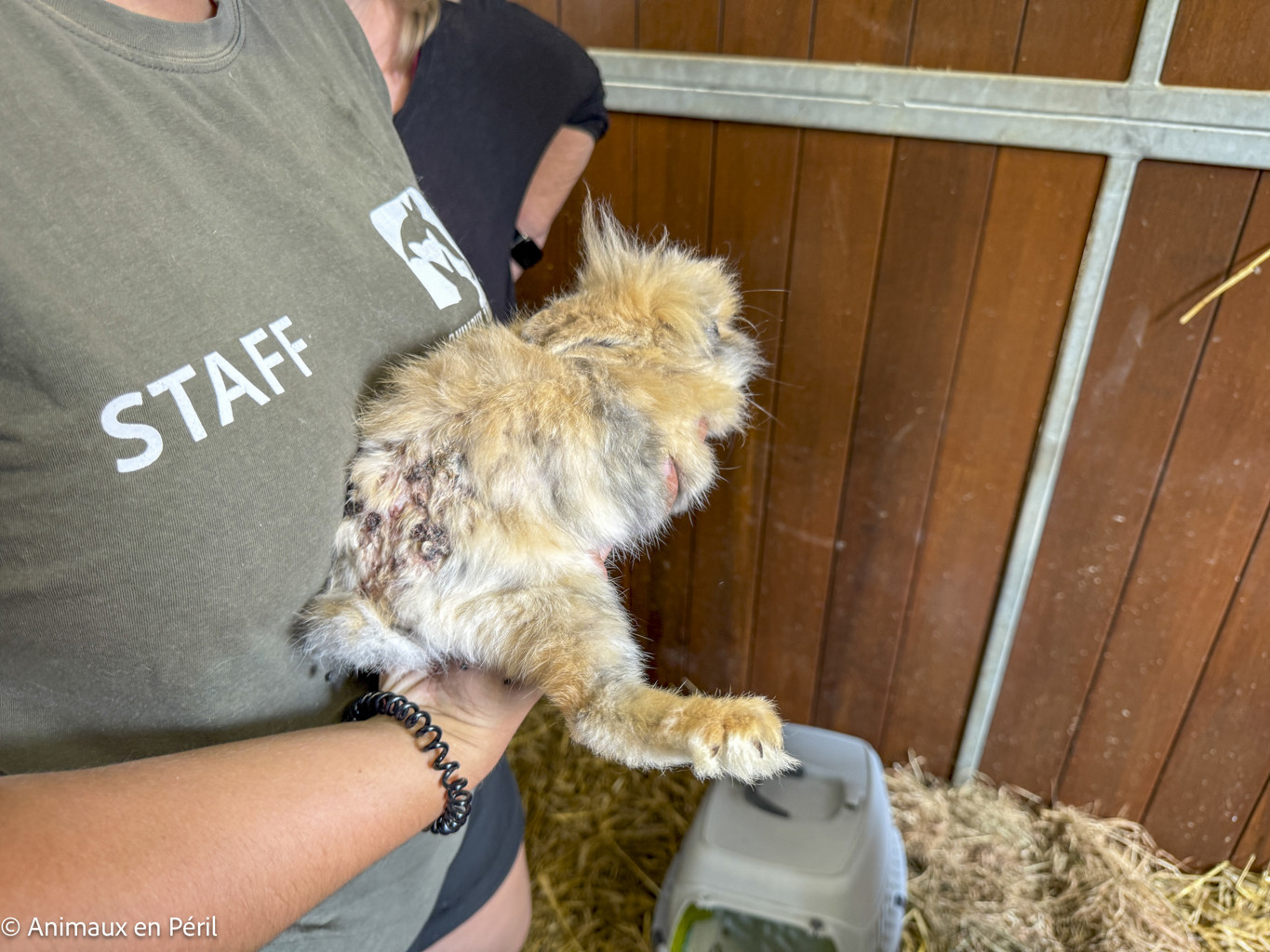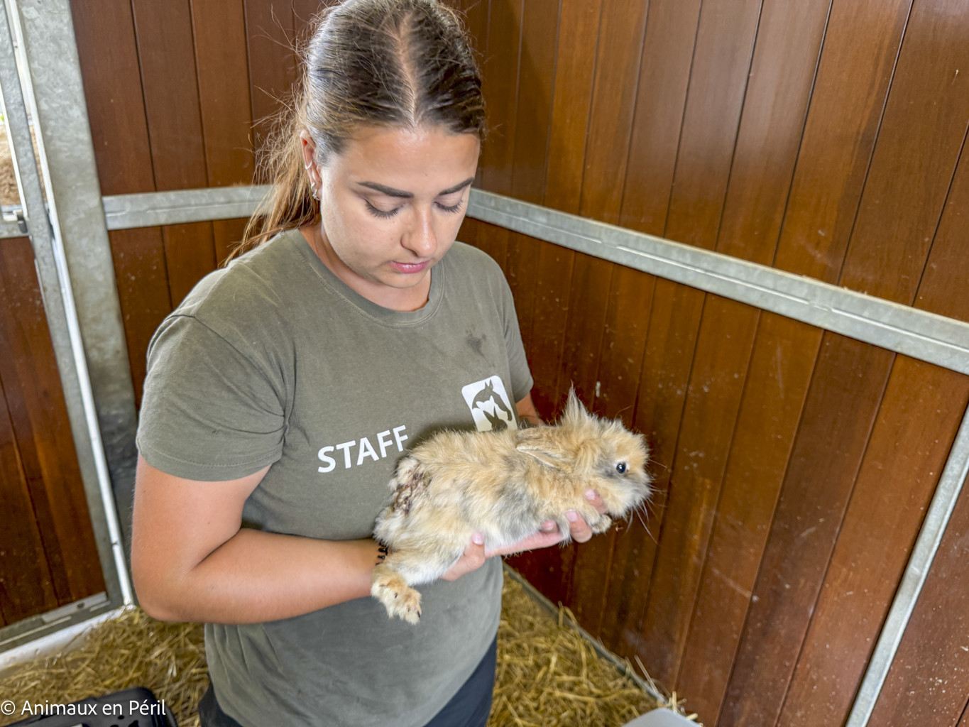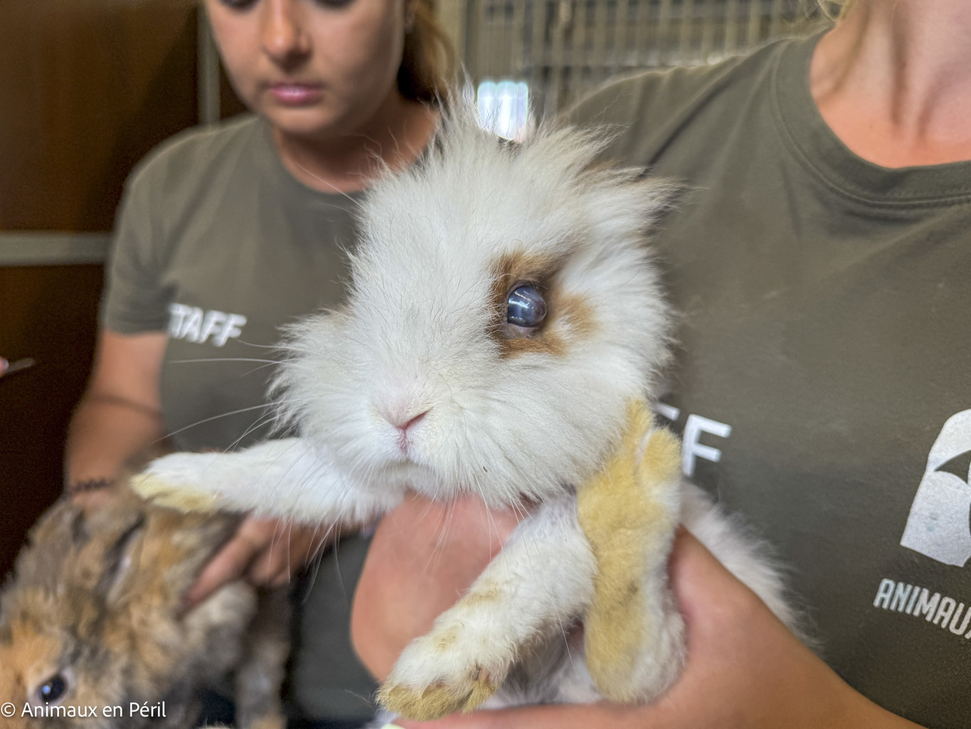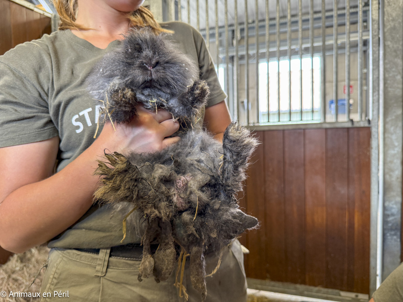 À l’origine : un couple de lapins acheté en animalerie puis laissé à se reproduire, sans jamais être stérilisé. Les propriétaires n’ont ni brossé les animaux (malgré leur pelage angora nécessitant un entretien quotidien), ni soigné les blessures dues aux bagarres, causées par la promiscuité extrême. Lorsque nous avons pris contact avec le propriétaire, ce dernier envisageait de "les relâcher dans la rue".