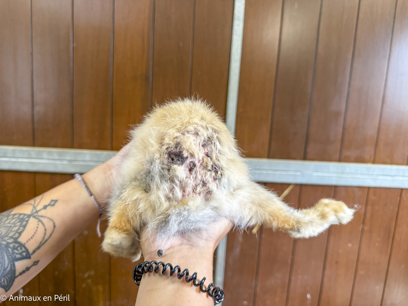 À leur arrivée, les constats ont été accablants : poils emmêlés, infections oculaires, blessures anciennes non soignées... L’une des lapines est dans un état critique : elle ne pèse que 900 grammes, souffre d’une patte disloquée, d’une queue cassée, et présente des plaies nécrosées sur l’arrière-train. Elle et d'autres cas graves ont été immédiatement transférés chez notre vétérinaire NAC pour prise en charge en urgence.
