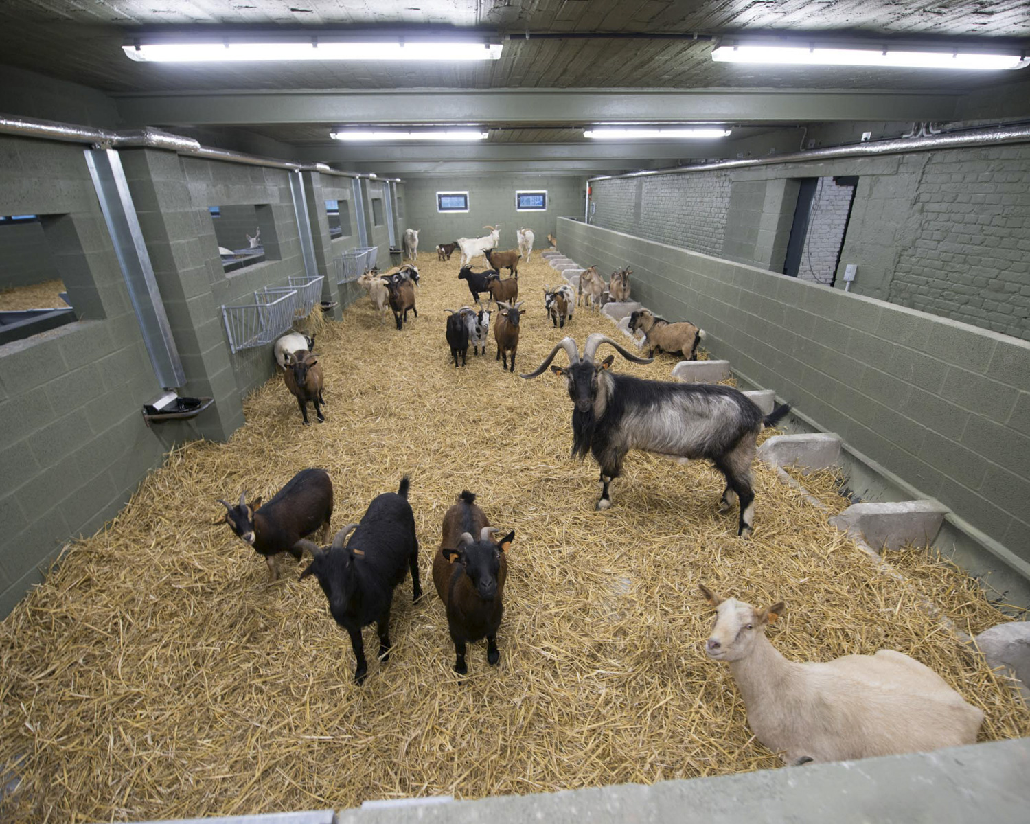 À Isières, un bâtiment offre deux vastes stabulations, l’une abritant les chèvres, l’autre les moutons. Un soin particulier a été apporté à l’aménagement, non seulement afin de rendre le cadre aussi agréable que possible, mais aussi pour assurer à chacun un accès aisé à la nourriture et à la boisson. Les stabulations ne sont occupées qu’aux saisons froides, l’été se déroulant en prairie.