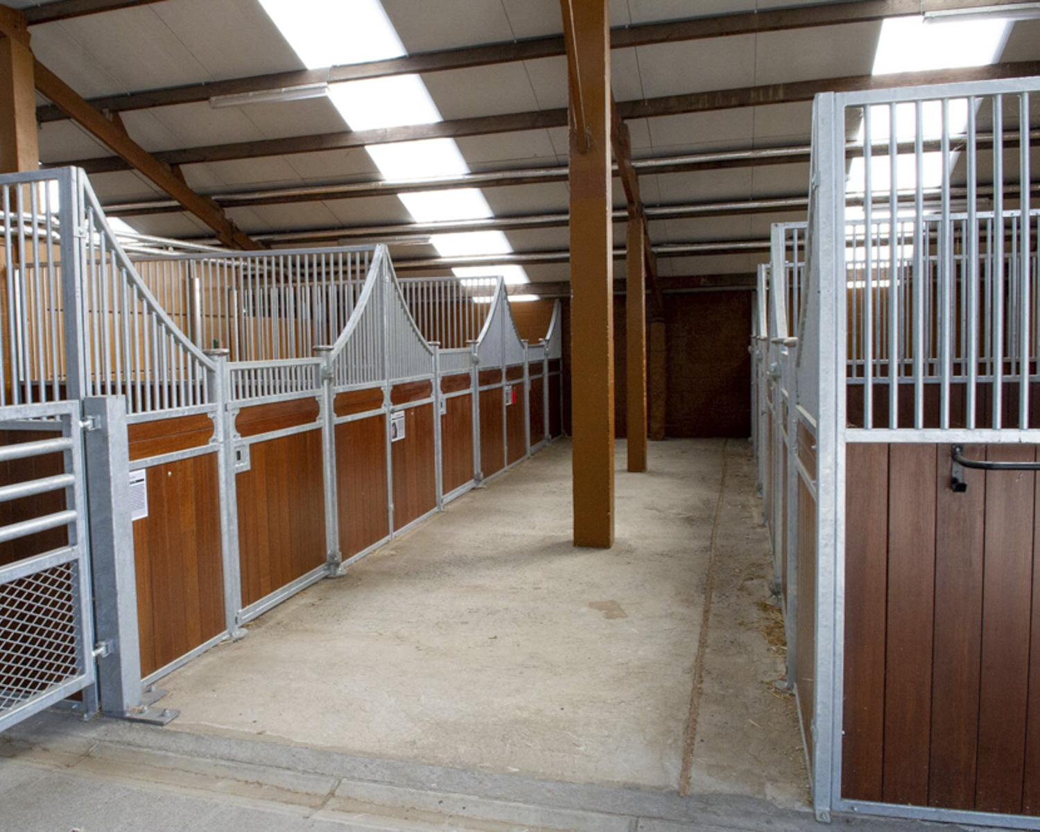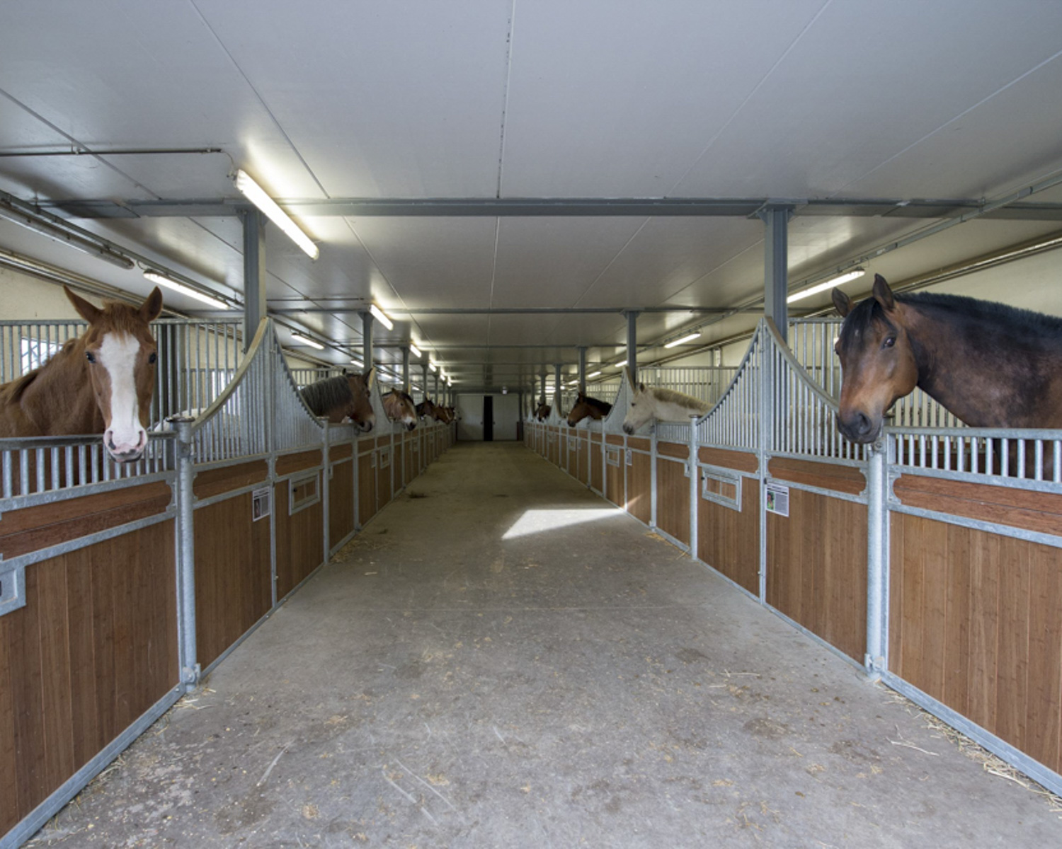 Les chevaux se répartissent à Meslin l’Evêque dans deux écuries vastes comme des nefs d’église, qui constituent les principales structures du domaine et au sein desquelles la fonctionnalité n’empêche pas la douceur de vivre. Chaque bâtiment est équipé de dizaines de boxes individuels de haute qualité, à la fois modernes et chaleureux, pensés en fonction du confort et de la sécurité de leurs occupants. Chacun comporte une mangeoire, un support de pierre à sel et un abreuvoir automatique.