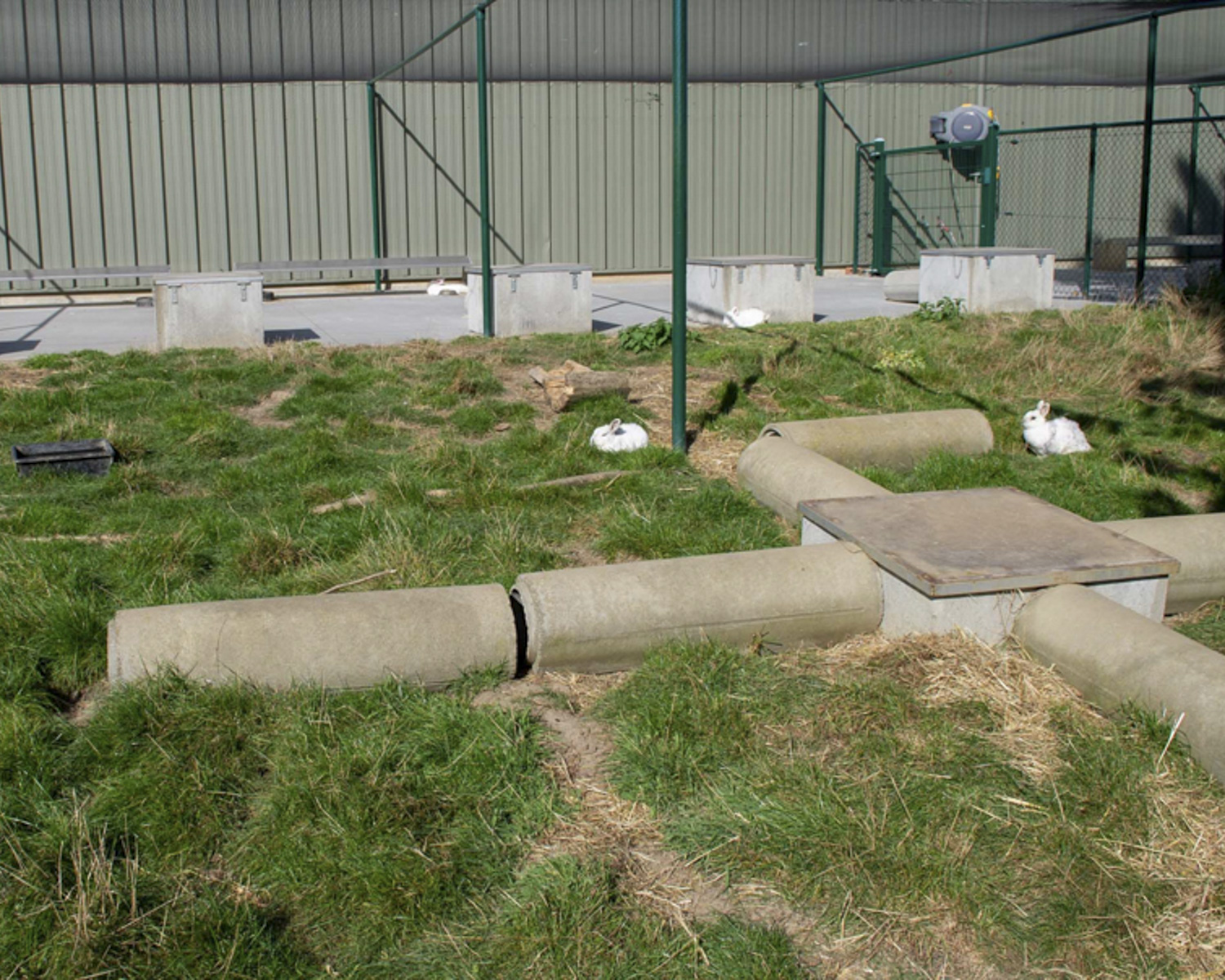 Le territoire des lapins consiste en deux zones identiques et adjacentes, équipées de manière similaire. Ces parcours jumeaux permettent une alternance, et les lapins occupent successivement un espace puis l’autre, ce qui autorise l’herbe à se régénérer entre deux périodes d’occupation et assure en permanence aux occupants une zone herbeuse en bon état.