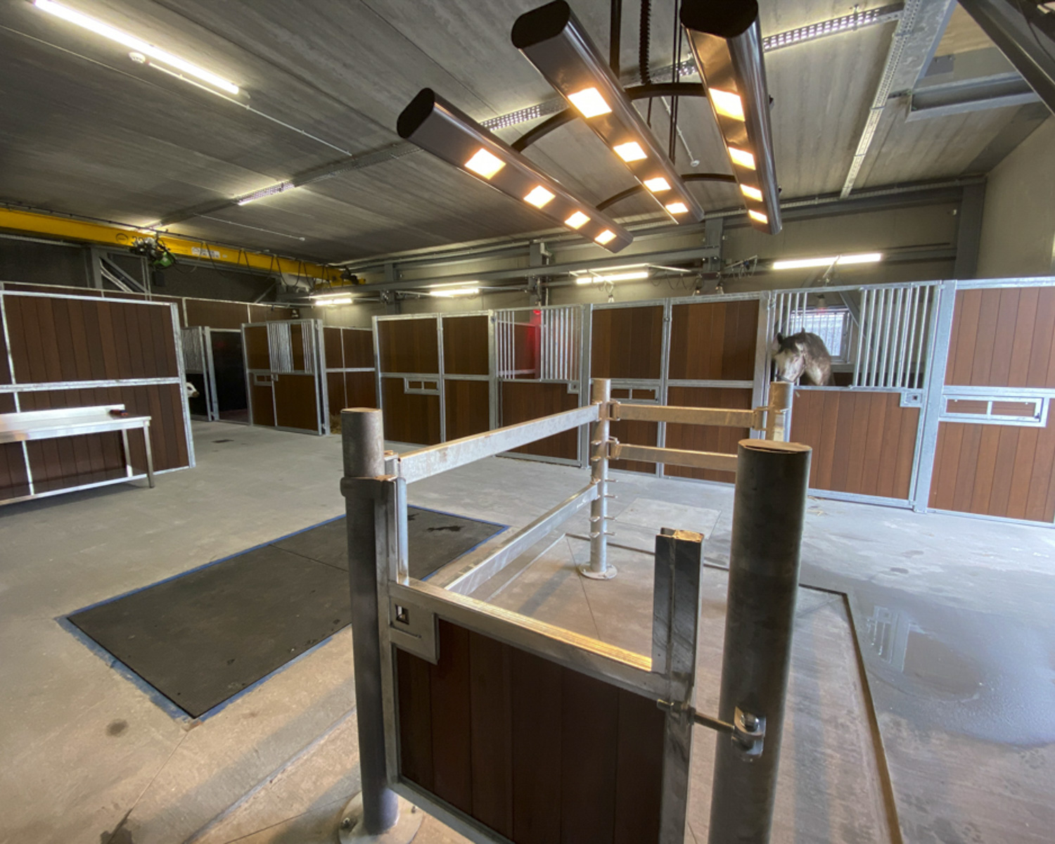 L’écurie la plus récente (800 mètres carrés au sol), inaugurée en 2015, a apporté vingt-huit boxes alignés le long de deux couloirs spacieux. Tous sont ouverts en croissant de lune sur leur façade frontale, offrant au cheval la possibilité de présenter l’encolure à l’extérieur sur toute la longueur de la cloison. Espace, lumière et air dominent les lieux, ainsi que le souci d’un entretien aisé, nécessaire dans un contexte où les boxes sont nettoyés et repaillés chaque jour.