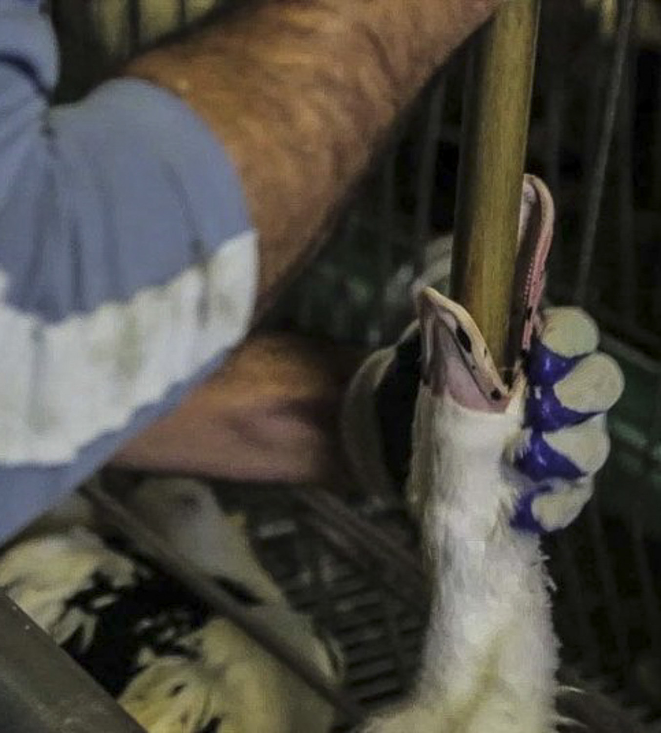 À part un abreuvoir, la cage est entièrement nue. Les oiseaux développent une posture et une locomotion anormales, des plaies aux ailes et des lésions aux pattes.L'alimentation forcée provoque des inflammations de l’œsophage et d’autres blessures.