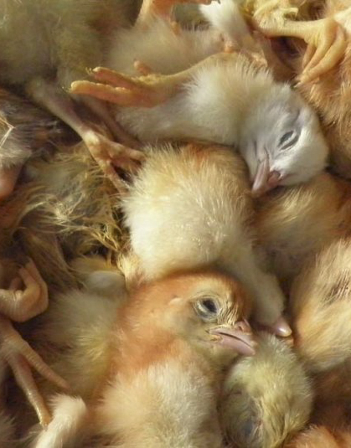 Le supplice des poules pondeuses destinées à l'élevage commence dès leurs premières minutes de vie, après l'éclosion de leur oeuf. Les poussins sont rapidement triés. Les mâles, d'aucune utilité pour les éleveurs, sont broyés, noyés ou jetés vivants dans des conteneurs à déchets. Les femelles rejoignent un élevage de ponte à 18 semaines où elles subiront une première mutilation : l'épointage des becs et donc de leurs principaux capteurs sensoriels.